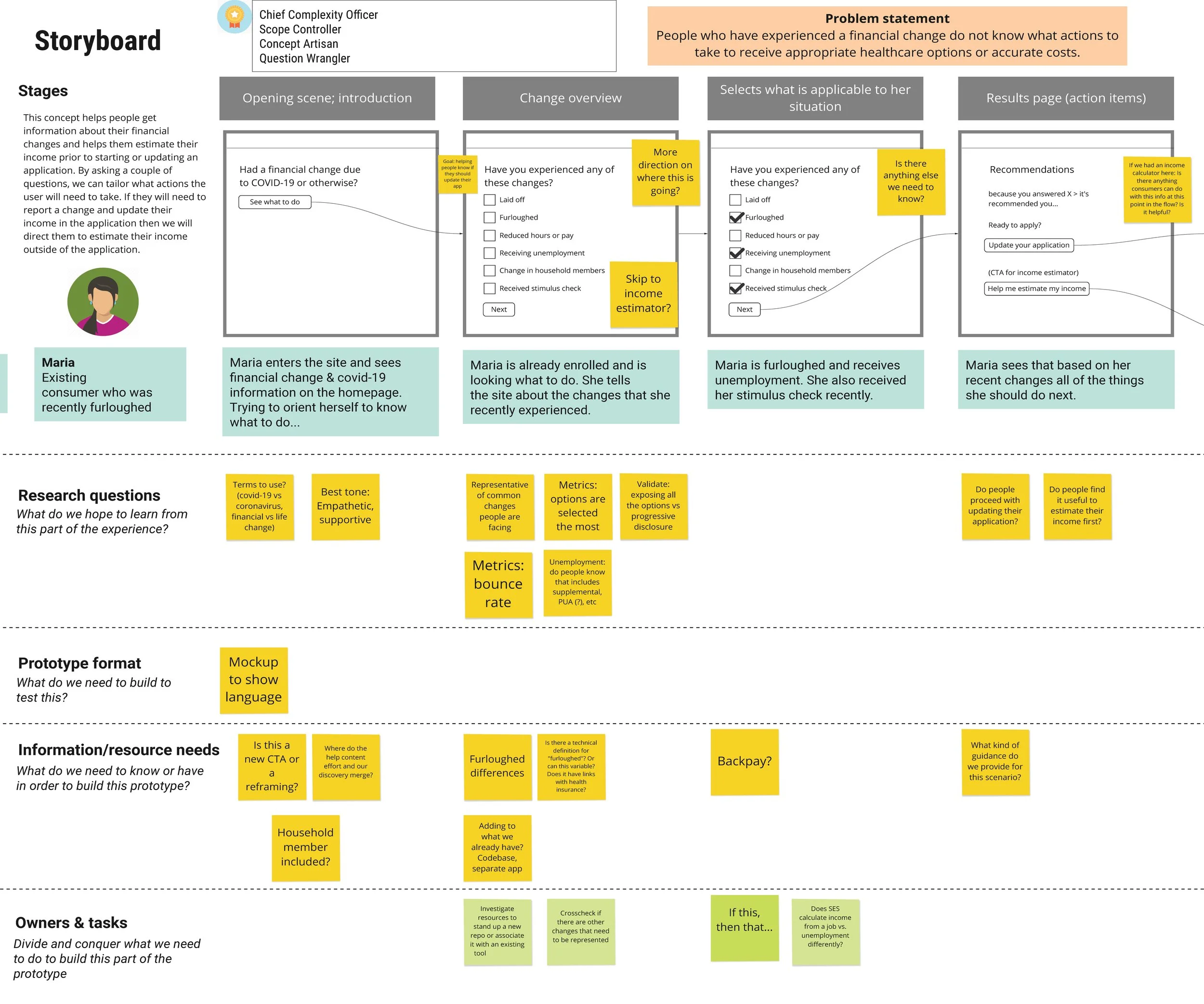 We advocated for a broader problem statement to help more people: People who have experience a financial change do not know what actions to take to receive appropriate healthcare options or accurate costs.